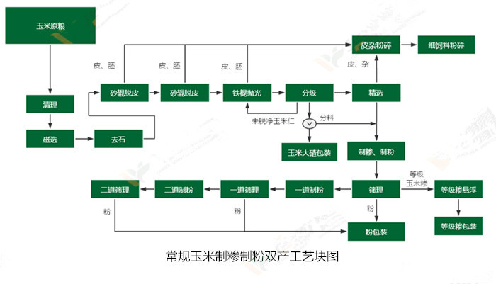 玉米加工設(shè)備采用全新的干法玉米加工方法,工藝先進,結(jié)構(gòu)緊湊,通過對玉米的清理、去皮、破渣、分級、提胚、整粒、拋光、磨粉、平篩分級等一系列工藝,可同時生產(chǎn)出玉米胚、不同粒度的玉米粉,脫脂玉米粉等產(chǎn)品。